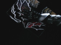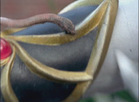 A tiny snake bites on Jenji's wrist gauntlet, until he knocks it off, it slides into an ouroboros shape. |