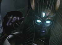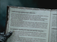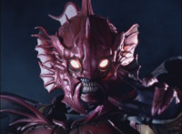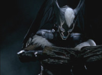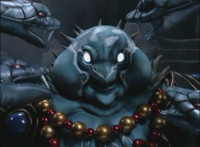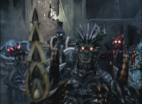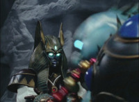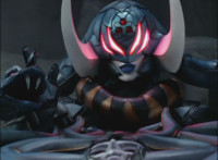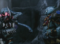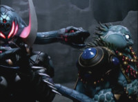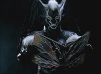 Necrolai sneaks up on the Book of Prophecies and manages to snag it, slaps it, then opens it up and reads from it. She talks to herself for a moment or two, then is noticed by Serpentina, who walks by, picks her up and dangles her there for a little bit, before tossing Necrolai aside. |