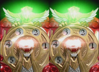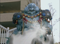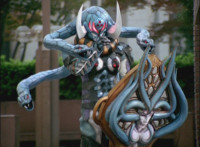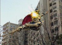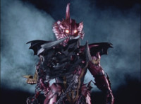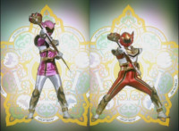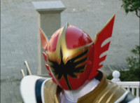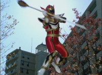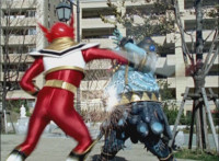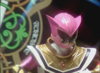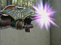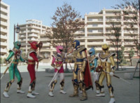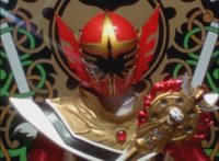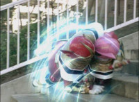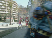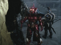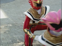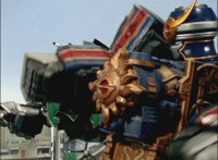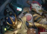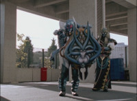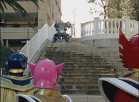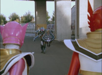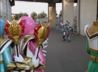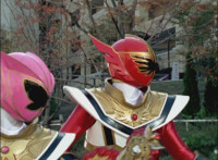 Flames spray upon Hekatoid, spark bursting him until he falls on his back. Pink regroups with Red, Hekatoid gets up, talks, then runs away. Pink & Red give chase, racing up some steps until Hekatoid appears at the top, speaks, then squeezes another chest wart. Acid shoots out, Red grabs Pink and the pair roll down the stairs as the acid overtakes them both, causing them to shimmer briefly. Once at the bottom of the stairs, the pair are taunted by Hekatoid, who hops up and down, the pair begin to recover, when Hekatoid pulls out his hammer. Suddenly, Solaris Knight leaps in and fires his Laser Lamp, spark bursting Hekatoid down. Solaris Knight lands, talks to Red & Pink, as the other three Rangers in Legend Mode also regroup with them. They all look upward as Hekatoid recovers, readies his hammer, then glows purple and grows gigantic. Zoom in on Red as he leads the team by turning the 3 on his Lion Staff dial, which gleams. |
