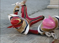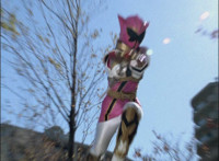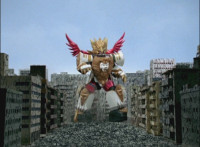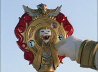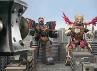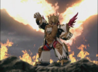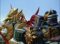 Red transforms into the Mystic Firebird. The other four Rangers morph together into the Mystic Lion. Firebird & Lion roar, then Manticore Megazord's eyes flash, before posing completed. |