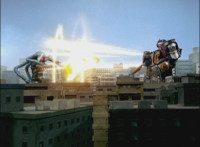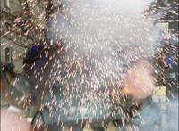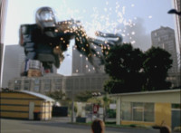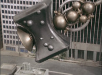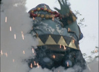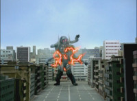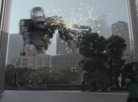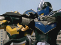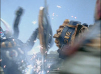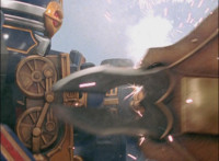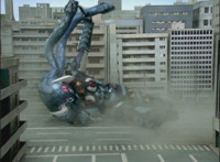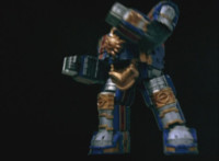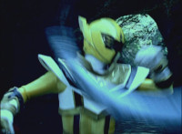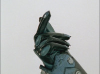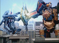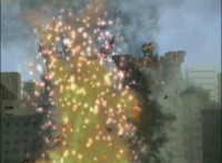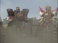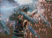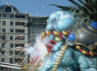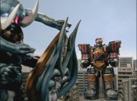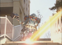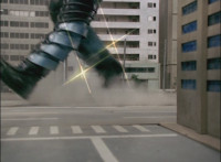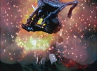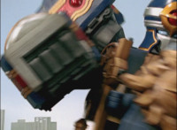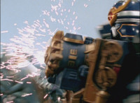 Recycled, per source; cuts follow-ups of pair of Megazords sparkily punching Hekatoid, before he recovers and readies hammer. |