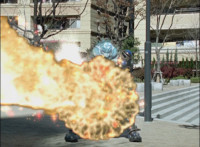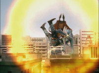 The golden whirlwind of flames strikes Serpentina, bursting her. Solar Streak Megazord joins Manticore Megazord's side, both battle ready. Serpentina, crackling, speaks, then collapses and explodes massively. |