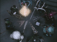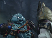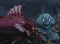 Sculpin talks to the ghost of Koragg, who soon responds. Sculpin points his trident at him, Koragg lifts his sword and responds some more, before rushing into Sculpin, splashing him with water as a result. When the spray clears, Koragg's nowhere to be seen. Sculpin addresses the vacant pond, and remains standing there for a moment. |