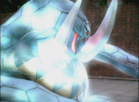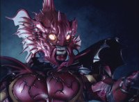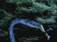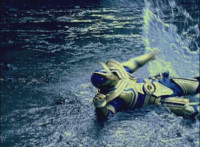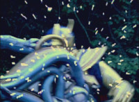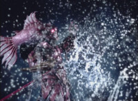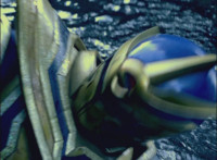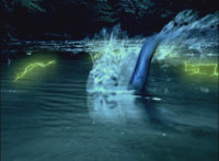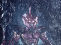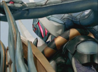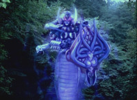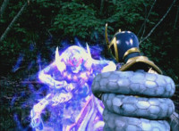 Serpentina shields herself, whips one tail outward, and slaps Solaris Knight into the river, but he quickly recovers. Serpentina reacts, and shield-jabs him sparkily twice, knocking him back down, where she then wraps her tail around his leg, picks him up into the air, and starts squeezing. Solaris Knight is trapped, so Serpentina morphs back into giant snake mode, and talks to him, he responds. Serpentina tightens her grip on him, he agonizes, then Serpentina in snake mode rises up and slowly bring her open mouth down upon Solaris Knight. |