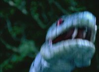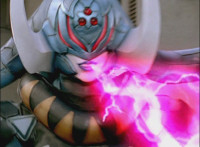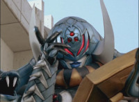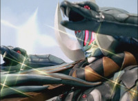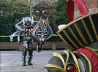 Serpentina waves her shield about, raining down purple balls of light that turn into snakes, which cover the ground, then teleport away. Suddenly, daylight returns, as Solar Streak Megazord makes the scene, posing at Serpentina, then marching forth. |