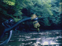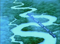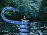 A giant snake head emerges from the river, Yellow's legs sticking out of its mouth. |