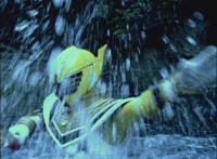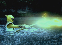 In a flash, Yellow appears in Legend Mode, emerging from the water, firing a bolt of yellow electricity from his Lion Staff, zapping the water before him and sending a snake leaping out and hitting him, pulling him down. |