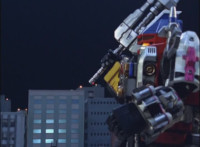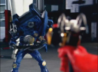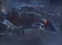 Cropped; cuts follow-up of Ultrog falling on his back while Red prepares his Drive Defender. |
