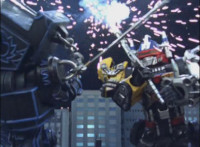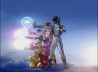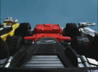 All five Rangers press a button on their Overdrive Trackers, as their Zords appear on a split screen. |