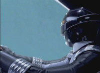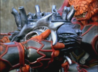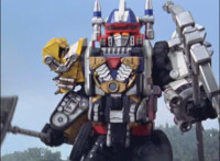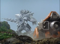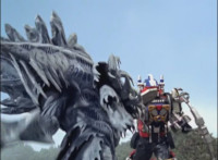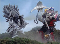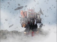 Weather Monster readies his saber arm and marches forth, DriveMax Megazord prepares its shovel and axe and does the same, both meeting in the middle of the area where the Megazord strikes the monster with each of its weapons to no avail, not hurting the creature whatsoever. Weather Monster then sparkily slashes the Megazord in return a few times, sending it staggering back, when the monster notices the Drill Driver approaching. Red drives the Drill Driver into Weather Monster's feet sparkily, then backs up and does it again, but before trying it a third time, Weather Monster spews wind from his chest hole, sending Drill Driver sliding away. DriveMax Megazord approaches and tries to shovel strike the monster again, which once more fails to register, but leaves it open to Weather Monster's hole-wind, gusting the Megazord back several yards. Red nod-talks, Drill Driver comes to a stop in front of the DriveMax Megazord. Red talks some more, presses some Overdrive Tracker buttons. |