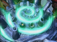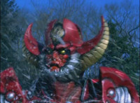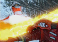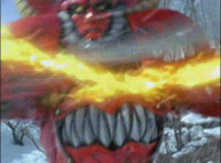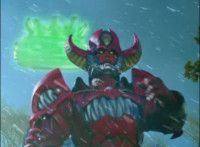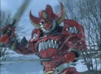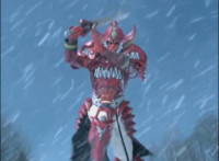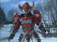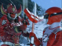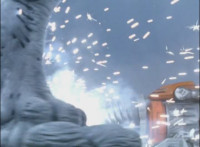 The pair of Lava Lizards keep fiddling with the weather device, one raising it up and talking, before the device's battery bursts with sparks, Moltor reacting, the Rangers regrouping wearily, as the weather device flies off the rest of the machine setup, and floats in the air, spinning as it glows and turns the weather suddenly to a blizzard. The Lava Lizards writhe on the ground, Moltor shields his face from the snowy winds. |