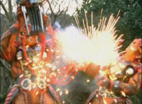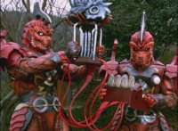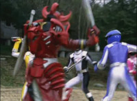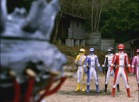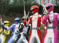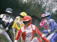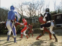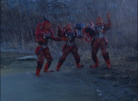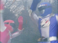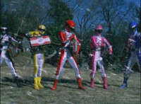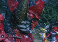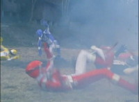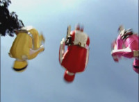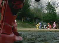 Yellow, Red, and Pink flip over the camera. All five Rangers then rush in and gang up on the Lava Lizards. |