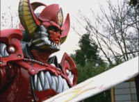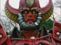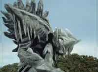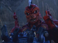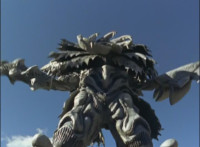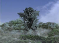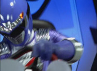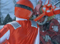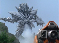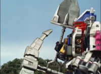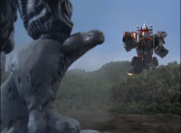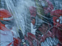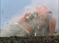 Squeezed; cuts follow-up of Megazord facing Weather Monster across the field. |