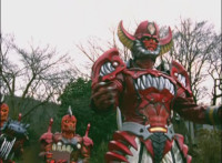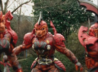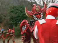 Red stands up and nod-talks, when suddenly a gusting of wind blows him and his teammates down onto the ground. When it ceases, Yellow shakes her head and looks around, Blue talking to her with a thumbs up. The Rangers react as they see Moltor approaching, talking as a pair of Lava Lizards behind him carry the weather device. Black nod-talks up close. |