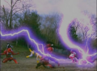 The Rangers dive out of the way as purple lightning crashes down upon the Lava Lizards, crackling them until the burst into flames. |