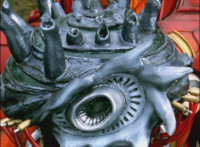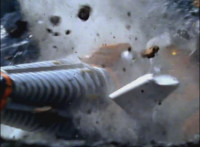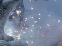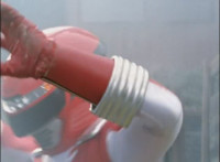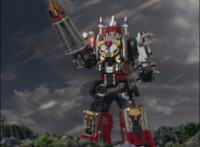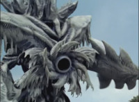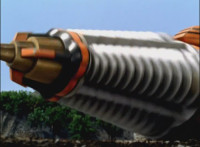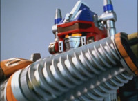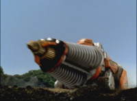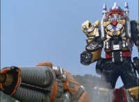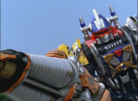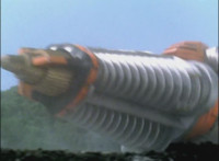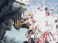 DriveMax Megazord takes its Drill arm, spinning with orange sparkles, amid an energy tunnel, rears it back, then stabs it forth. Close side POV of the Drill arm as its stabbed into Weather Monster's chest hole, spinning all the while as it drills, soon disintegrating the entire monster before the Megazord into a shower of debris. |