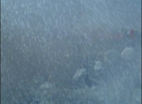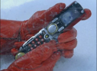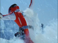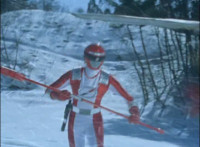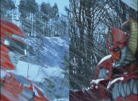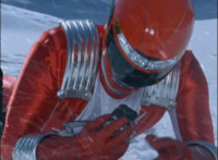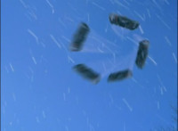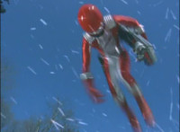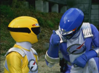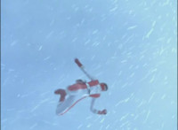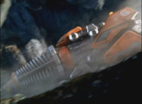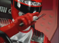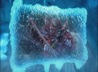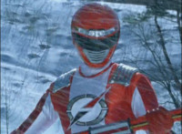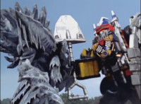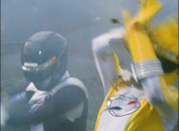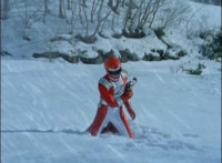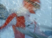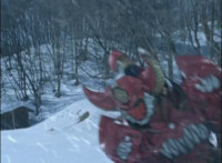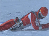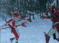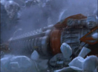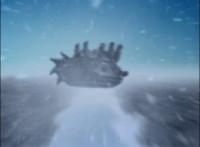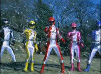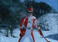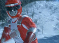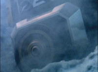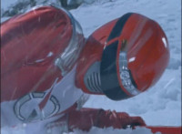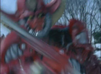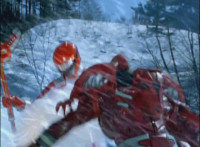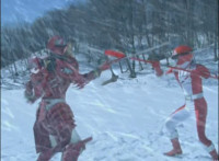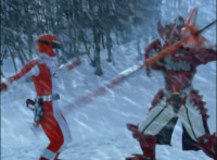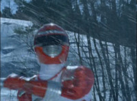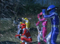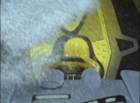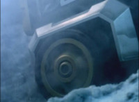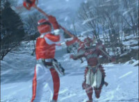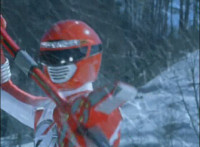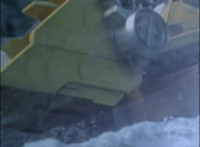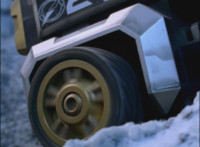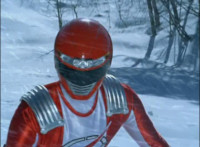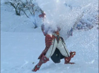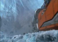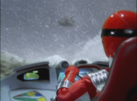 Console display tracks the weather device, zoom in to see as it continues to spin through the air, creating a blizzard everywhere it goes. Blue's cockpit suddenly jolts, his Gyro Driver overwhelmed by the snow, until his cockpit window gets flooded under a wave of snow. Red nod-talks in his cockpit, then looks up and sees an avalanche. Pink reacts, as does Black, as snow engulfs both their Zords. Yellow reacts right before her's does as well, not to mention Red, who quickly grabs his Overdrive Tracker and bails out before getting trapped like his teammates. He rolls down a snowbank. |