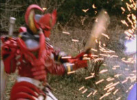 Moltor breaks off from Red, then precedes to disarm the Ranger, sparkily slashing him, before double slashing with energy flames into Red, who bursts before flipping through the air, and firing back at Moltor with his Drive Defender, bursting him in return. We cut to a sudden explosion of purple magicaly fire, which flings Moltor into the air. |