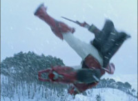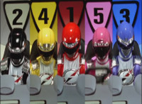The five control console cases drop down from the snowy sky, landing in each Ranger's possession. Red then leads the team in flipping over the camera. The five DriveMax Zords race to our left. |