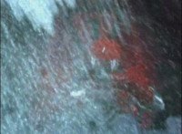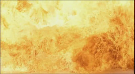 Cropped; cuts follow-up of Red seen through the subsiding flames. |