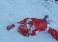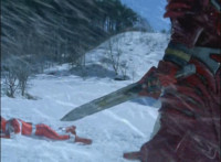 Red kneels in the snow, gripping his shoulder, before collapsing. |