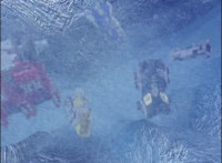 Pan down to the bottom of the steaming ice chasm, as the five DriveMax Zords lie in a heap. Pink awakens in her cockpit, and anxiously nod-talks. Blue awakens and responds. Yellow does also, giving a peace sign. Black speaks, then grabs his controls with both hands, pushing them forth. Speed Driver's wheel spin, but it moves not an inch, same for Dozer Driver. Yellow ceases working her controls and shakes her hands in the air while speaking. Gyro Driver's propellers fail to lift it off the snowy ground, Blue nod-talking. Speed Driver's wheels keep spinning, Black slams his fists down in anger. Pink nod-talks up close. |