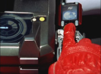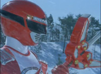 Snowy winds blow at the Rangers, Blue nod-talks and gestures, pan over to Moltor talking. Red responds to him. Moltor replies back, the weather device glows and spins off, so Moltor follows. The Rangers about to give chase, when Red pauses them, and leads the team in pulling out Overdrive Trackers to summon. |