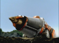 Drill Driver emerges from underground, Red's cockpit shaking up briefly as it lands, then it rolls along in the middle of nowhere. Red works the controls, when suddenly orange electricity begins to crackle through his body! Drill Driver comes to a halt, as Red slumps over his steering wheel. He slowly lifts his head, then grips the controls, and Drill Driver's drills start spinning again. Red eagerly nod-talks up close, then Drill Driver drills into the ground. Red continues to pilot it as it goes deep underground, then deeper, finally breaking through a rock wall and emerging in the snowy area, speaking briefly before drilling through the ice chasm with all the DriveMax Zords. Red speaks to his teammates. Pan across the Zords, all cold, and unmoving. Red reacts and looks at his console. |