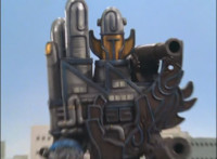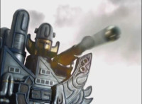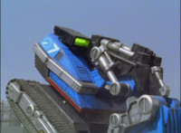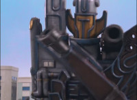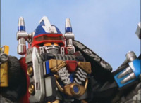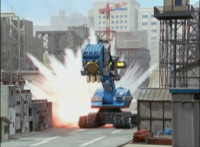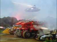 DriveMax Megazord in Shovel Formation stands battle ready. Bombardo fires a cannonball forth. |