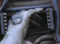 Pink works the controls and presses on the pedal, causing Shovel Driver to use its shovel to lift itself off of the side of the structure. |