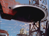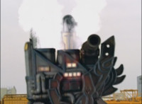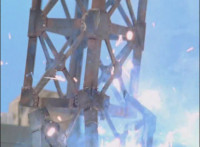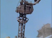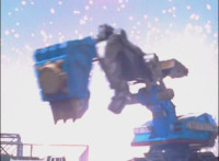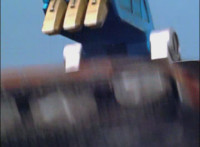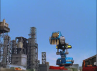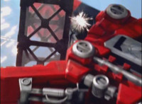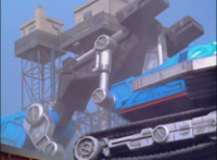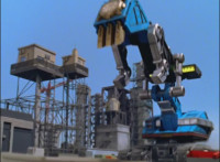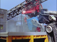 Close zoom in on Pink reacting, as Dump Driver's leg-arms reach out and snag the tower sparkily. Pink reacts, Red talks to her from his cockpit. |