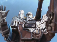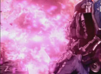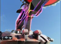 Quick shot of Pink moving her arm, DriveMax Megazord lifts its Shovel arm, Bombardo gets up to face it. Shovel charged up, DriveMax Megazord sparkily punches Bombardo in the gut. |