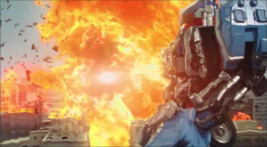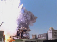 DriveMax Megazord in Shovel Formation turns to its side as Bombardo crackles, then explodes massively into purple flames. |