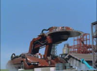 DriveMax Megazord uses its Shovel hand to backhand the cannonballs away. Bombardo rushes forth, DriveMax grabs him with its Shovel hand, Pink works the controls, the Megazord lifts the monster high into the air, spinning him around. |