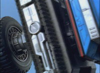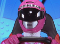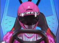Pink works the steering wheel, DriveMax Megazord releases Bombardo from its Shovel hand, sending him flying across the city. |