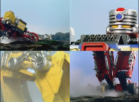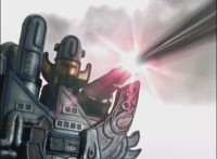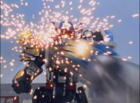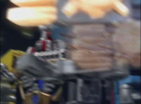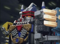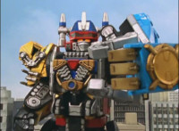 DriveMax Megazord punches its Shovel fist a few more times, before extending it into Bombardo burstingly, causing his lights to flash, before the Megazord pulls it out. |