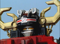 The Megazord locks into Cement and Crane as boots, and finally a new helmet locks into place, eyes flashing and horns extending. |