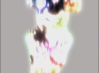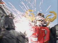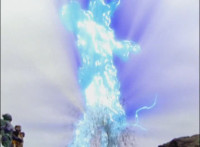 Red's helmet headlights light up, as the Defender Vest materializes on his chest, and he reaches up and makes the Drill Blaster appear in hand, then aims it forth at Mig, who turns to see him. Red speaks, Cheetar reacts and rushes in and takes the Spiral Shot blast for his two fellow Fearcats. They're all knocked down, Mig then talking to Cheetar, who crackles before him. Cheetar responds, then turns and stands facing the Rangers as he sheds his mortal coil and becomes an energy blob that grows gigantic and reforms as his giant body. |