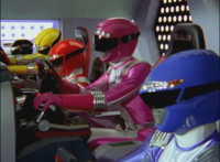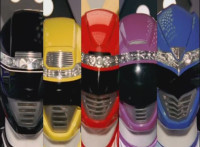 All five Rangers' heads on a split screen giving the final battle cry. |