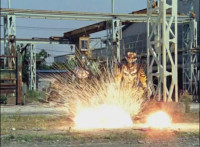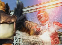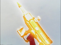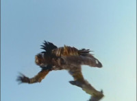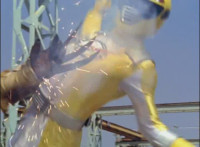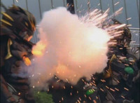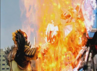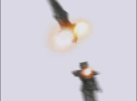 Shots 3 & 4 are squeezed, others are cropped; magic sparkles added to flames in shots 3 & 4; cuts shot 6 before Ultrazord sparkily bops Benglo; cuts follow-up of Benglo landing then Mig firing upon the Ultrazord which manuevers around the bolts. |