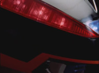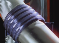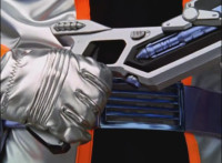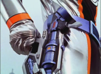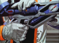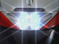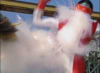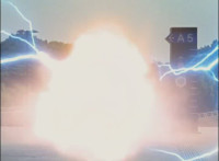 Close-up of Mercury's helmet headlights flashing, as he readies his Drive Detector, twirls around and energy slashes forth, the bluish-white wave hitting the Fearcats and exploding them massively. |