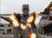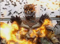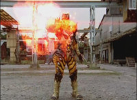 Push in on Benglo as his stone body starts to crack and ignite, the Rangers reacting, as he shatters the stone form over him, then gestures arms and flings energy flames at the Rangers, bursting them down. |
