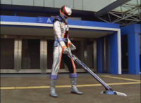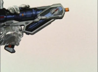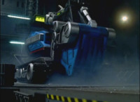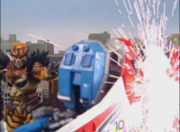 Mig readies his bazooka and fires it at DriveMax Ultrazord's back, bursting it, before Benglo goes to strike it from the front. |