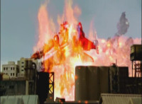 Cropped; cuts shot 2 short before we see flames lingering; cuts follow-up close-up of Mercury and then Fearcats recovering, then another Mercury shot. |