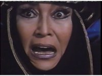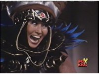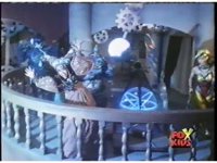 As a bright light flashes upon the scene, the balcony shakes, Rita throws arms up, losing wand, then collapsing onto her right side, prompting Baboo, Scorpina, and Goldar to rush to her side, while Squatt goes after her dropped wand. |