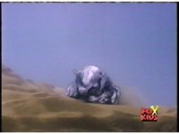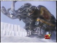 Triceratops Dinozord drives through the desert, approaching us from the distance, when it's struck by white energy beam, causing it to freeze in place. |