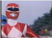 After Red Ranger lands, the other four Rangers join his side, each grabbing onto the Power Blaster or (in the girls' cases) touching his shoulders. |