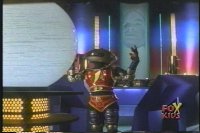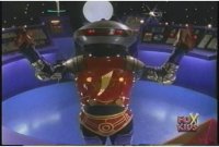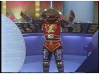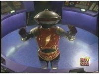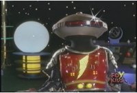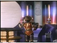 Alpha stands in middle of console floor watching Viewing Globe, raising arms and leaning forward, Zordon talks, causing the robot to turn to face him. |