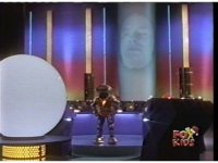 Alpha stands uncomfortably close to Viewing Globe, leaning forth and moving arms a few times, bent at elbows, as Zordon watches in background. |