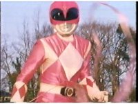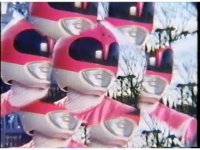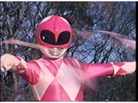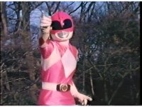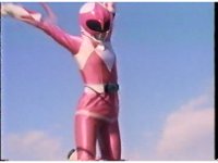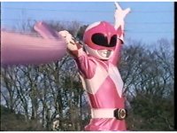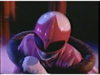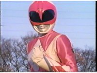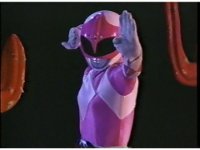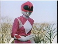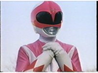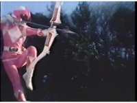Zoom out from helmet, as Pink Ranger crosses Power Bow to her side then flings it upward. |